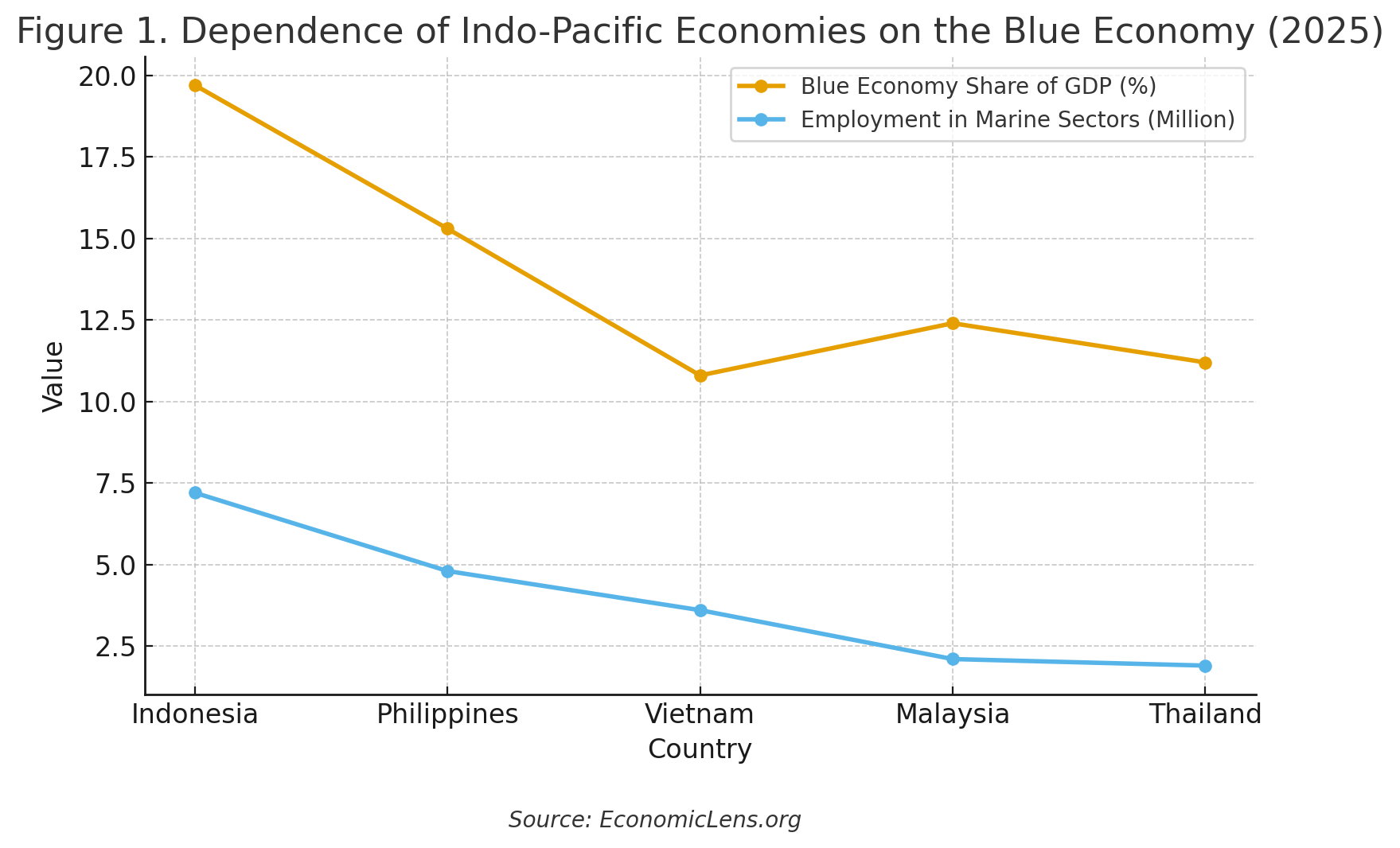 The economic framework of the Indo-Pacific is intrinsically reliant on the water. The blue economy significantly contributes to GDP, employment, exports, and food security in Southeast Asia. Over 70 percent of the population resides in coastal areas, with millions relying on fisheries, aquaculture, and tourism for their livelihoods (FAO, 2025; World Bank, 2025).